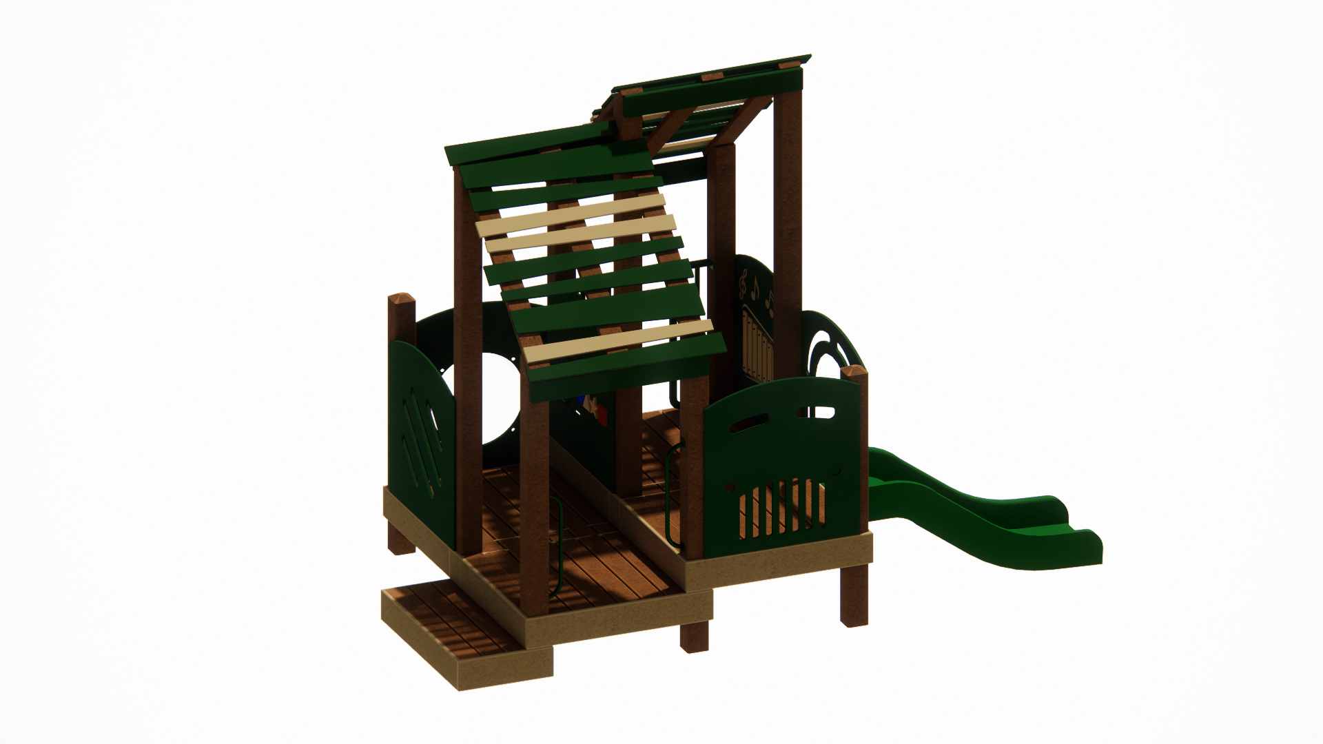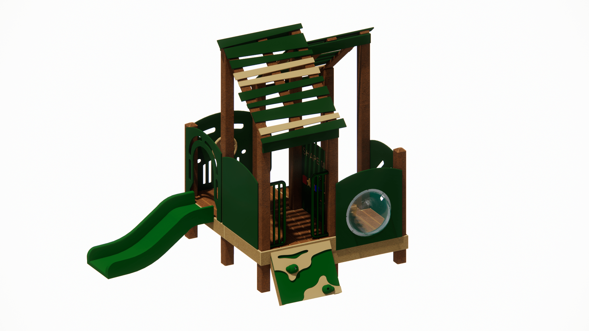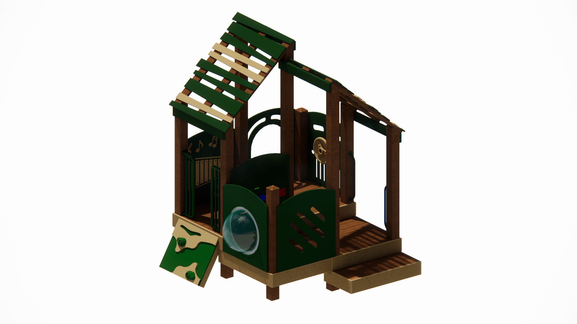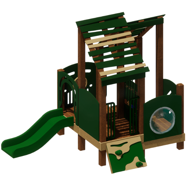 The Hideaway play structure offers young children a cozy space to climb, slide, and explore. Designed for early learners, it features a tot slide, wall climber, and multiple activity panels that support sensory and imaginative play. The chime panel, shape maze, bubble window, and driving panel keep little ones engaged with hands-on interaction from every angle. Overhead roofs provide shade, creating a comfortable spot for all-day play. Made from durable materials in our standard tan and green, this system is built for lasting fun in any early childhood setting.