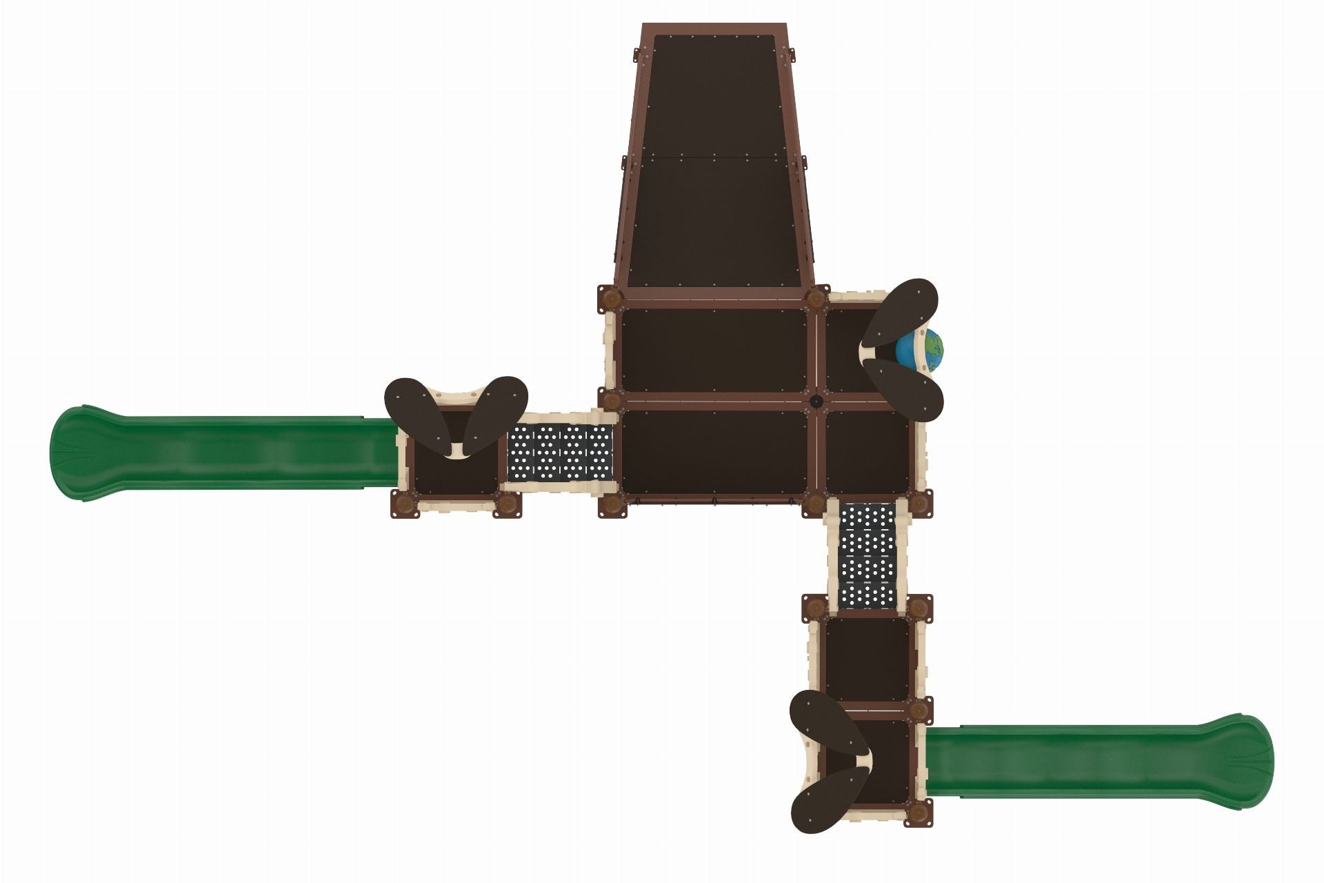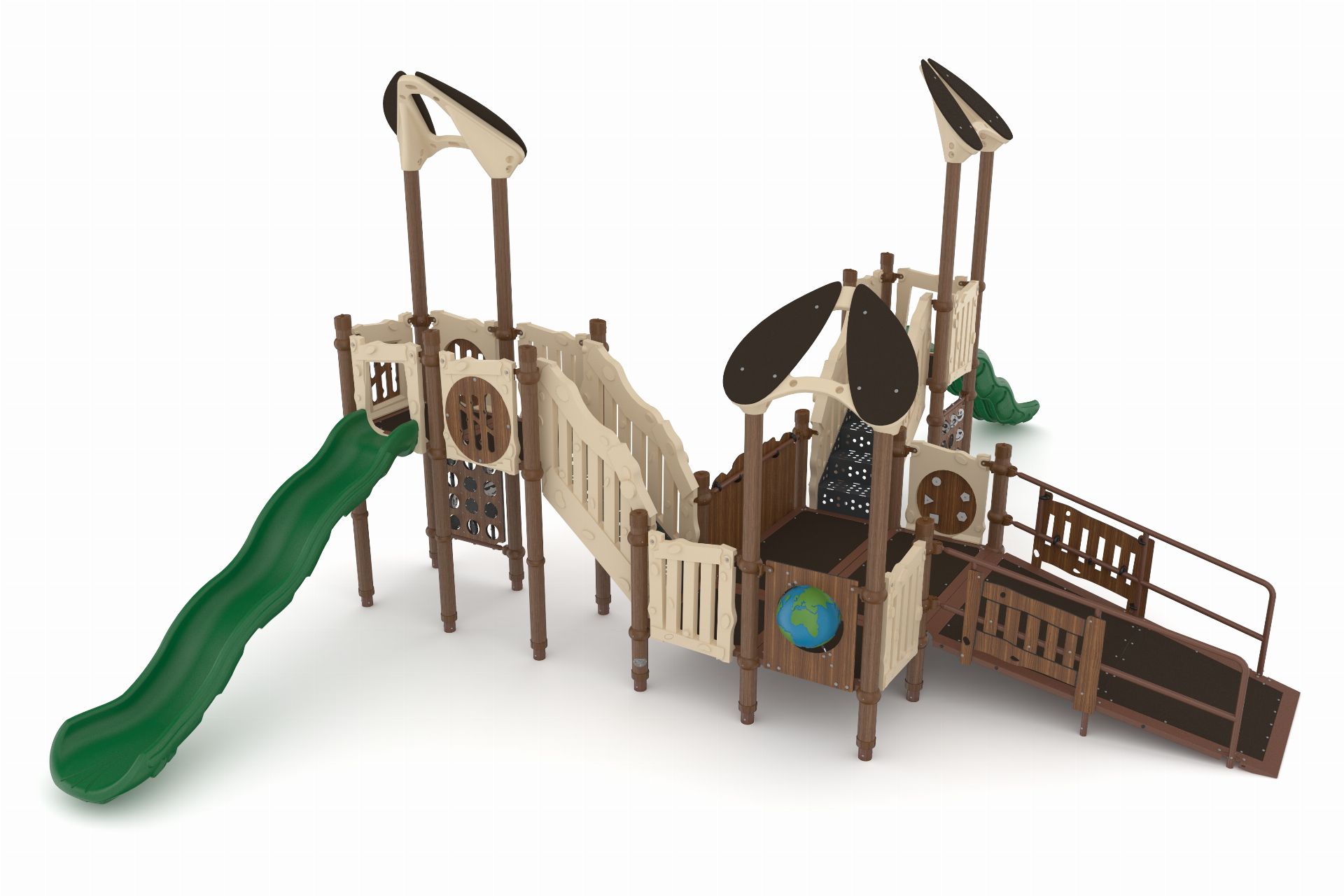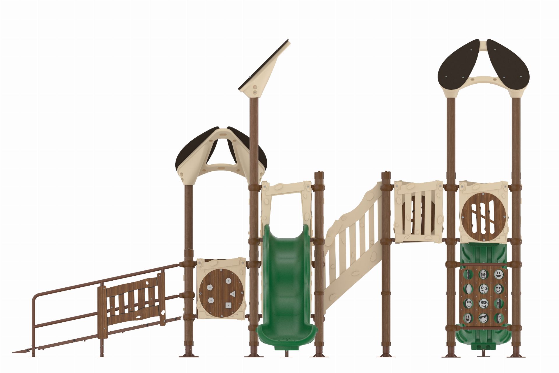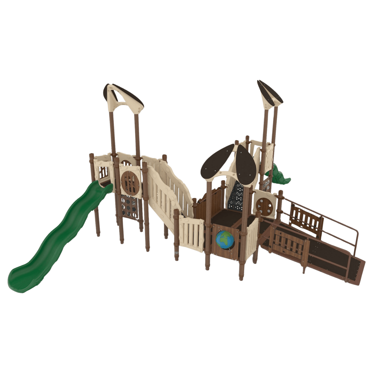 This system includes multiple elevated platforms connected by a bridge, along with slides and climbing elements that support movement between levels. As children move through the structure, they build balance, coordination, and strength. In addition, integrated play panels and activity features support sensory engagement and social interaction. The ramped entry provides accessible access to key play areas, allowing more children to participate together while supporting inclusive play.