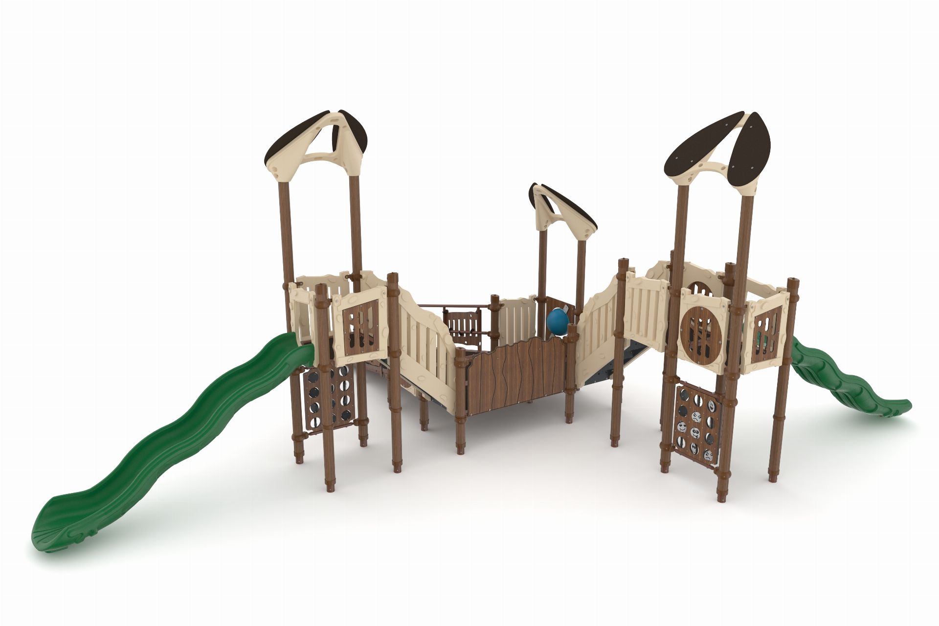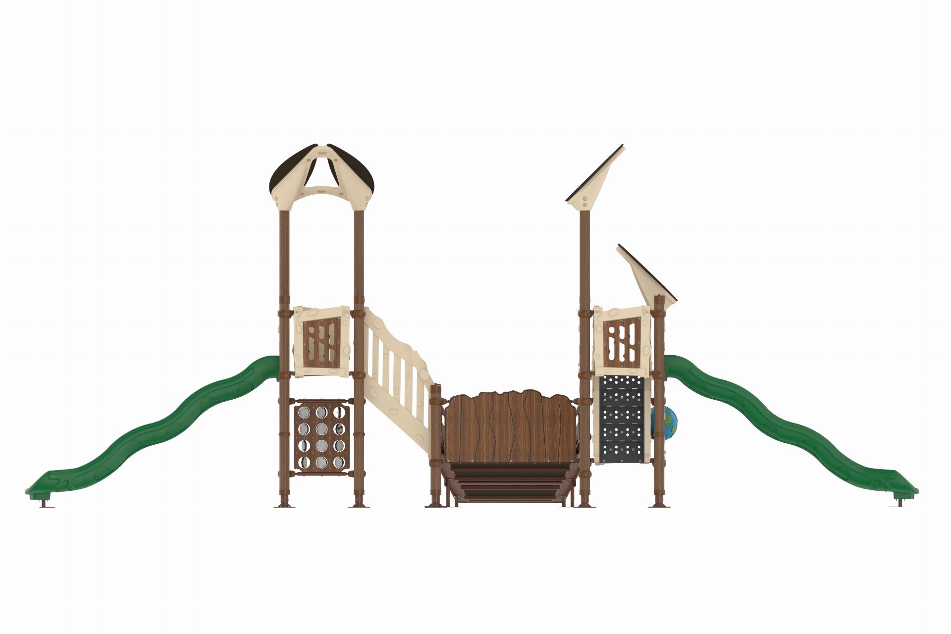 The Timber Series AGTS 214 is a nature-inspired playground system that combines elevated play, accessible design, and interactive features. Its wood-look structure creates a warm, inviting environment that encourages exploration and active play.