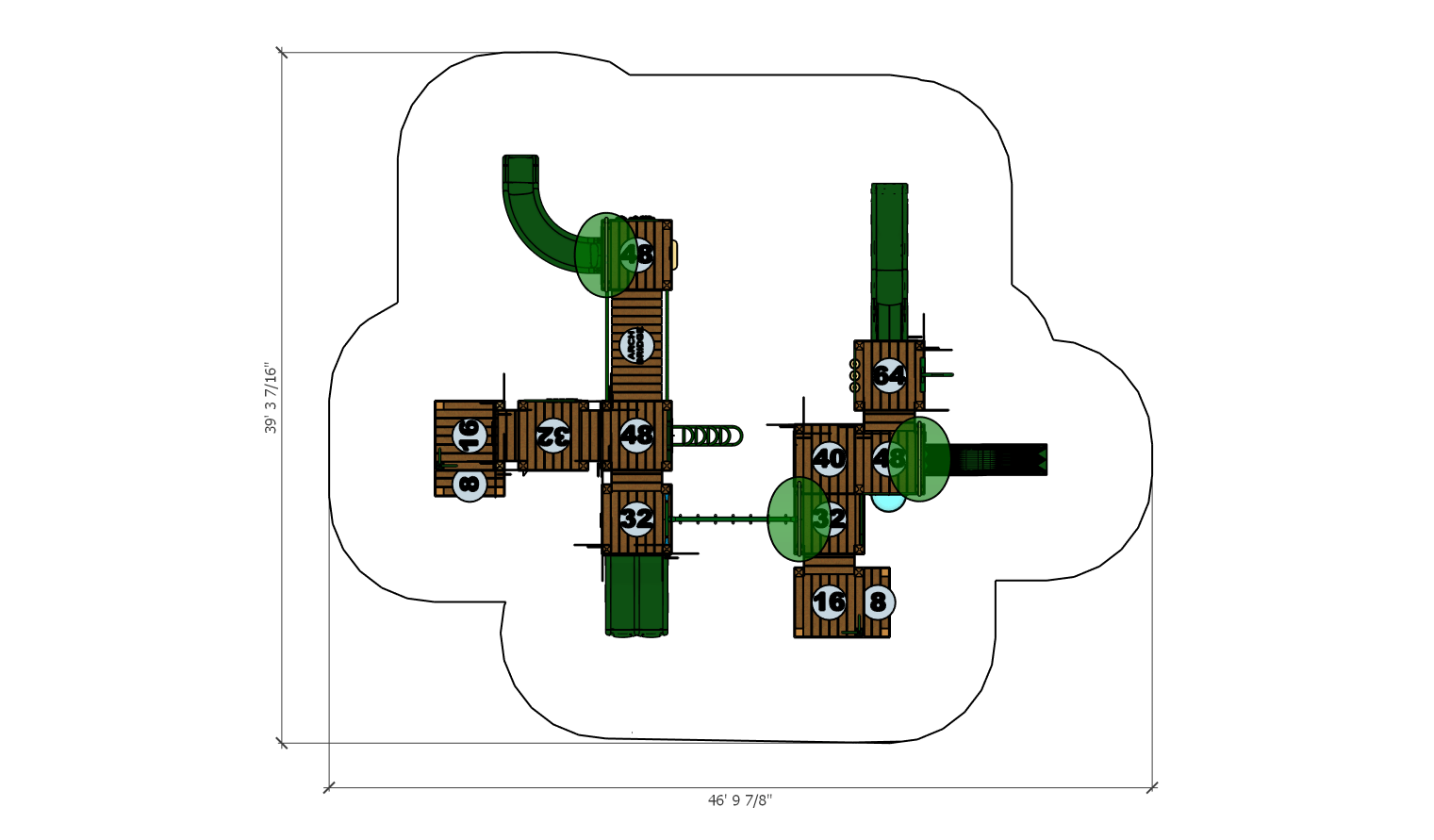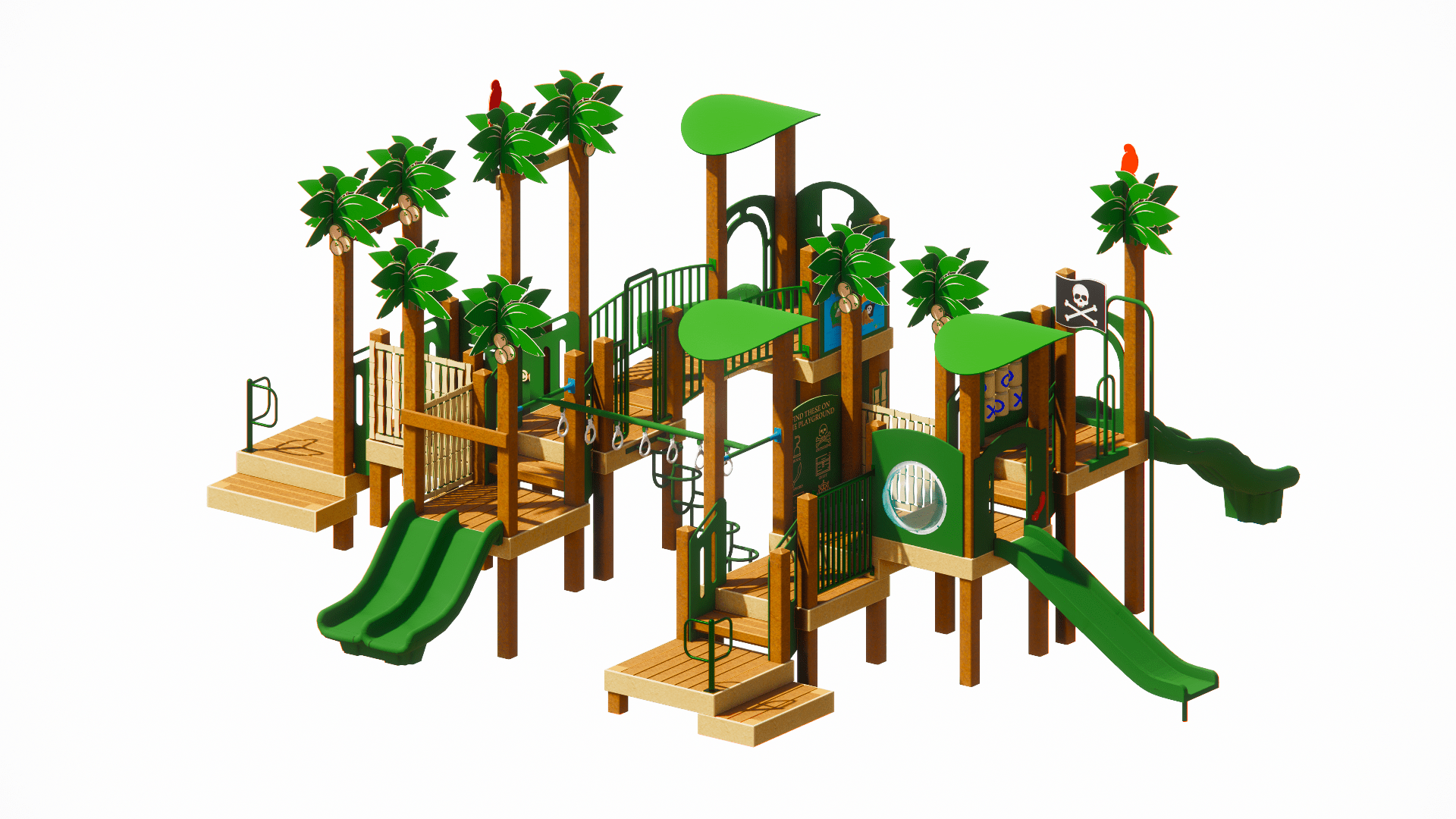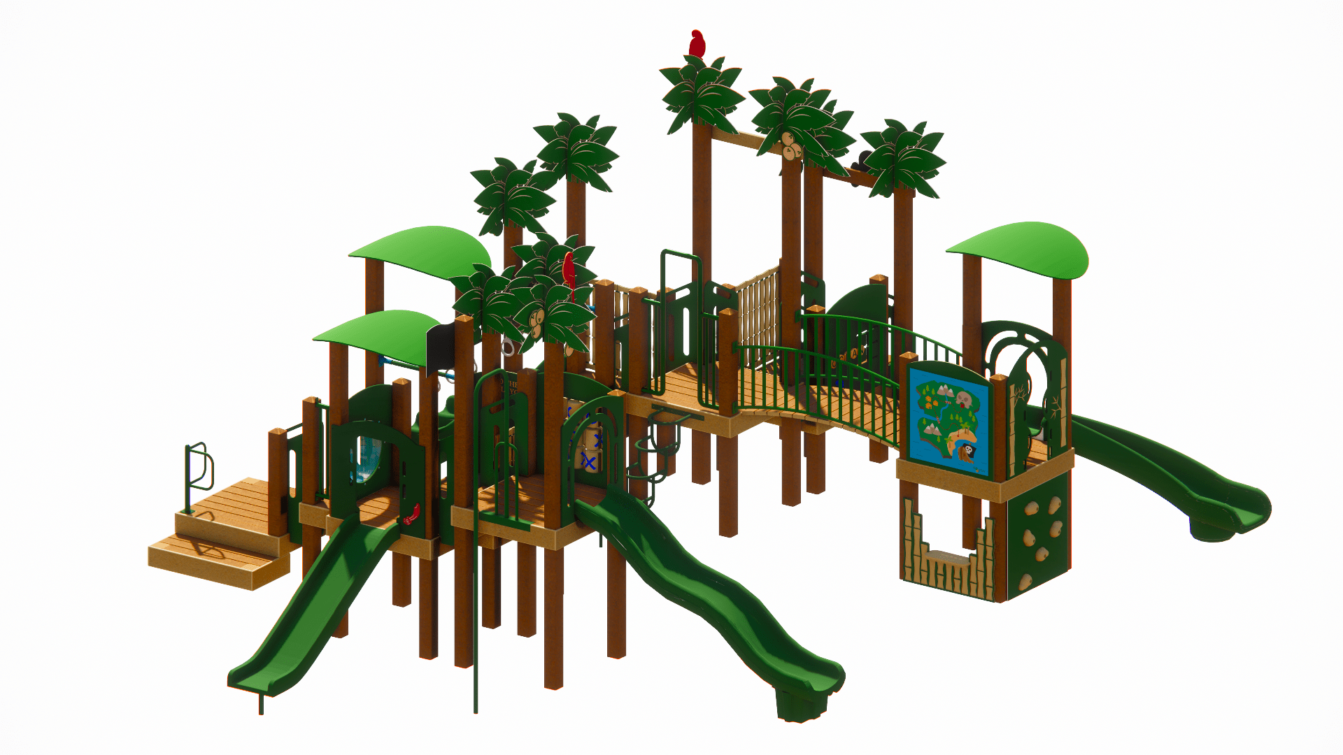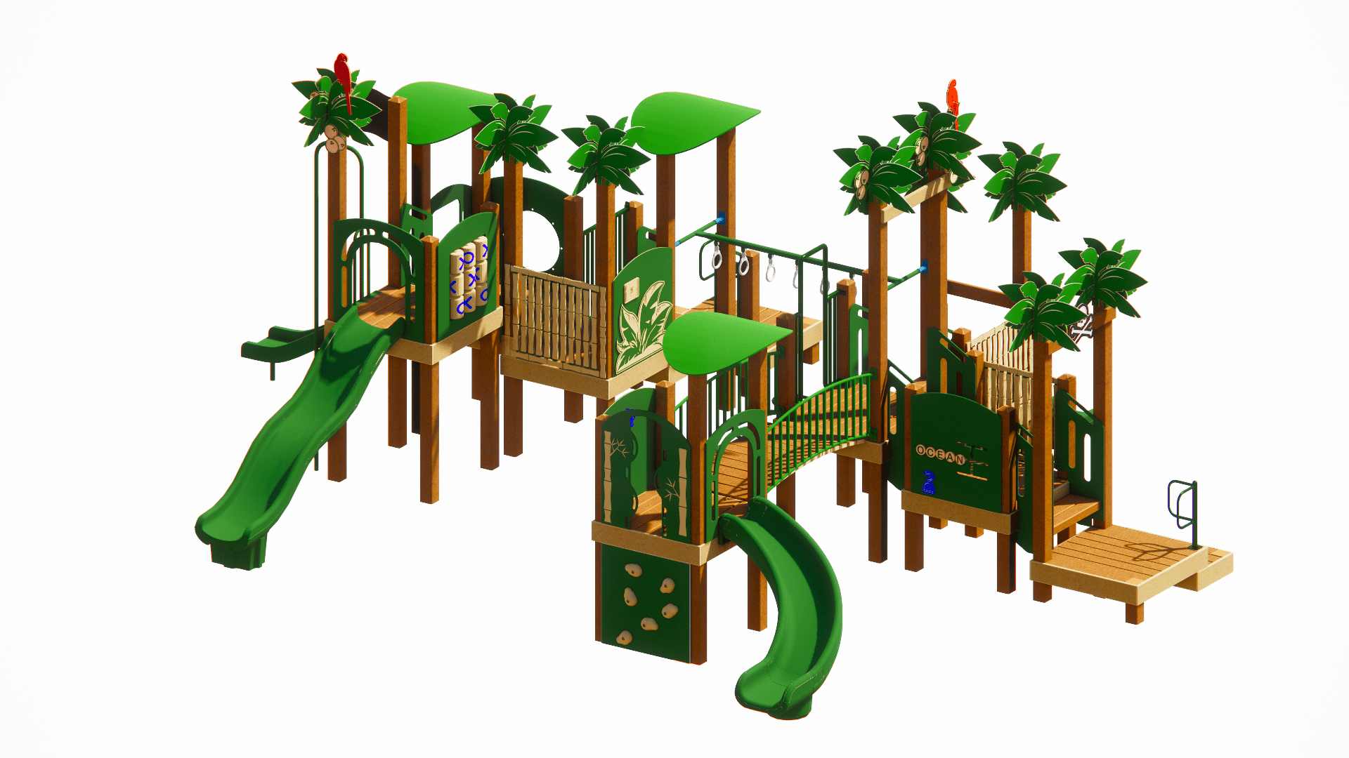 A curved slide and a straight slide offer exciting ride-down options from the raised platforms, while step platforms and climbers promote balance, coordination, and active play. Clear bubble elements create fun lookout points, and cozy areas beneath select decks invite imaginative games and small-group hangouts. With interactive play features placed throughout, the Tropicana encourages creativity, social play, and nonstop exploration.