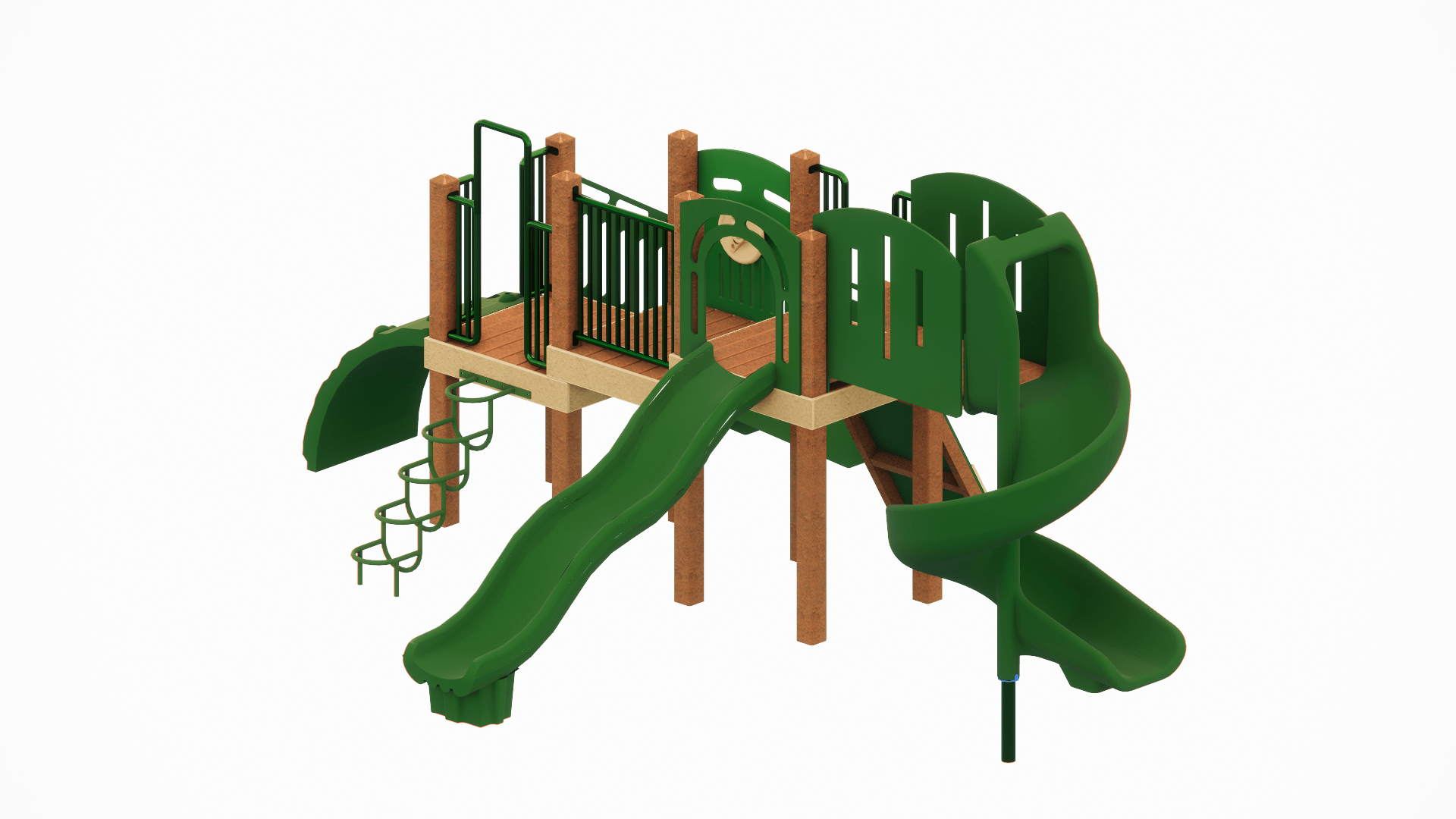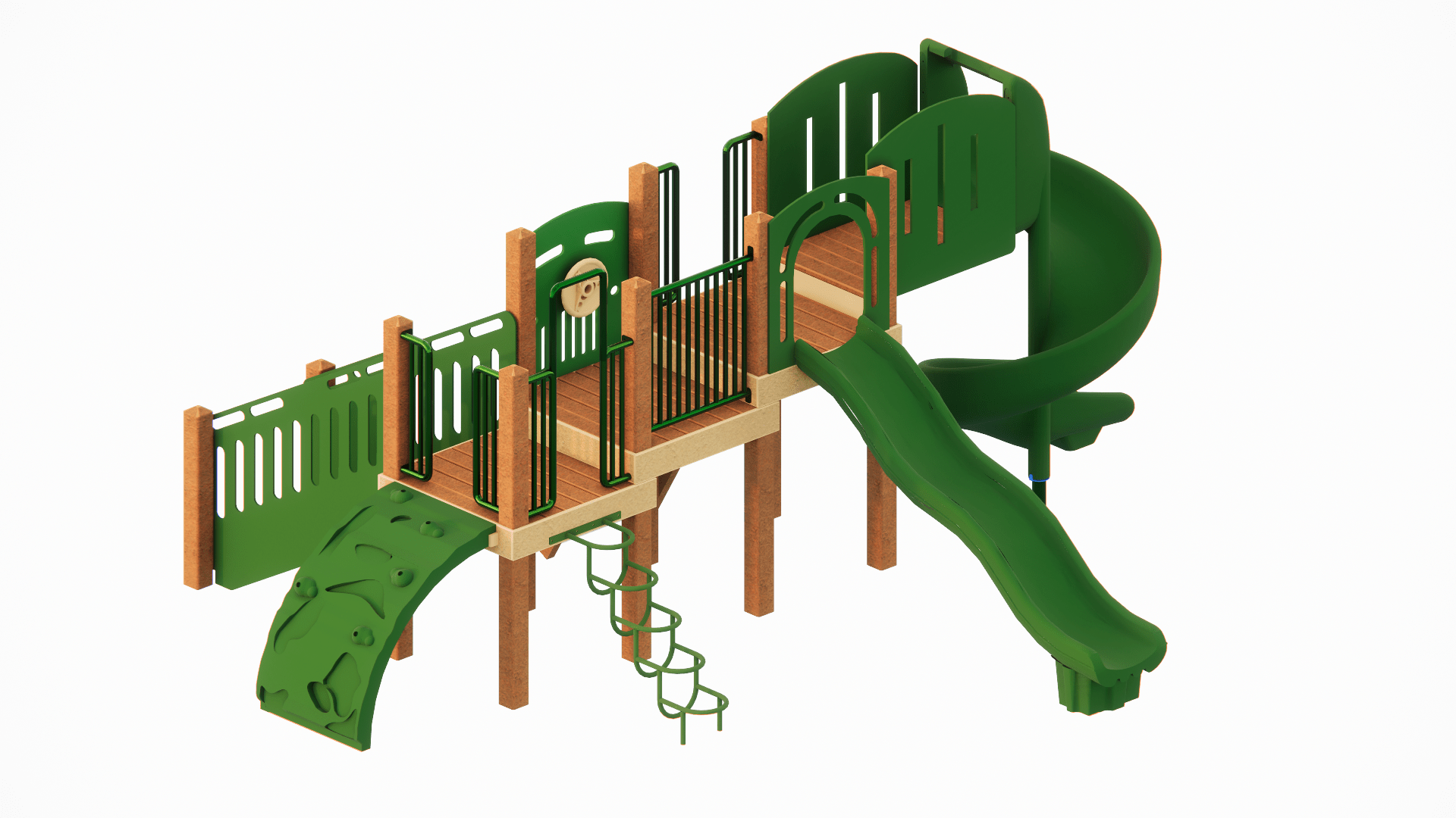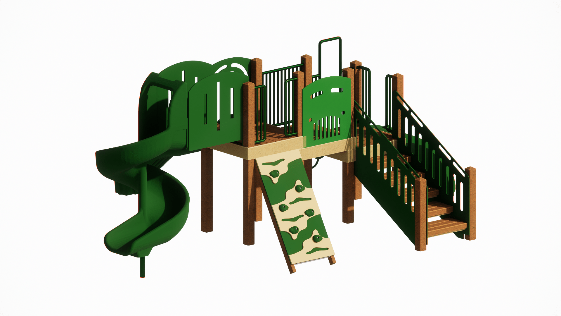 Compact in size but big on play value, the Wyoming Play Structure offers a well-rounded mix of physical and imaginative activities for children ages 5–12. It features a spiral slide and wave slide for classic fun, while the inclined rock trek and loop climber provide active challenges that support coordination and strength-building.